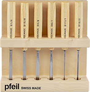 Description: Pfeil Compact Gouge Set More Product Info: Pfeil Compact Gouge Set - six pieces. Overall length 200 mm. Blade length 90 mm. Swiss-made. Comes with rack made of birch and maple. |